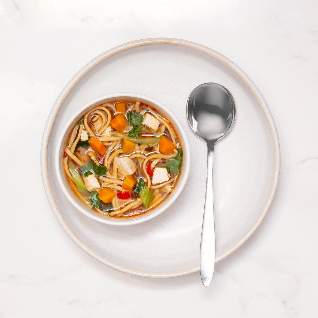 Our Chicken Noodle Soup is a light yet satisfying bowl that warms you from the inside out. Made with tender poached chicken breast, fresh vegetables, and a homemade chicken stock, this dish is balanced with just the right amount of soft egg noodles. At only 154 calories and packed with 17 g of protein, it’s a wholesome choice for lunch or a lighter meal that still keeps you fuelled.